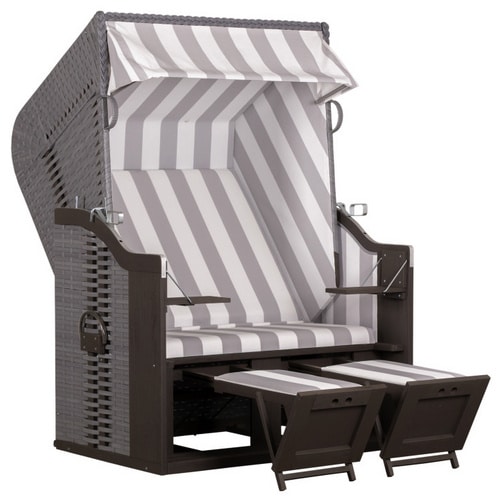 Die Sitz- und Liegeflächen sind mit hochwertigen Bezügen versehen, die sowohl angenehm zur Haut sind als auch pflegeleicht konzipiert wurden. Bei diesem Modell in Grau-Braun wird oft auf eine harmonische Kombination aus zwei Farbtönen gesetzt, die dem Strandkorb eine edle und natürliche Optik verleihen. Die wetterfeste Polsterung bietet optimalen Sitzkomfort und ist strapazierfähig genug für den täglichen Gebrauch im Außenbereich.