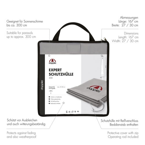 Die Hülle schützt Ihren Sonnenschirm vor UV-Strahlung, Regen, Schnee, Hagel, Staub, Pollen und anderen Umwelteinflüssen. Dies verhindert Ausbleichen, Materialermüdung, Stockflecken und mechanische Beschädigungen.