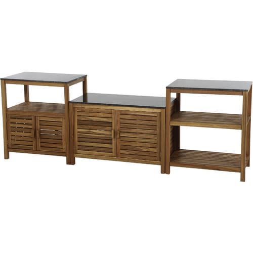 Das 3er-Set »Riva« besteht typischerweise aus drei separaten Modulen, die als Arbeitsfläche, Ablage oder Tisch dienen können. Die genaue Konfiguration und Funktion jedes Moduls ist auf die Schaffung eines funktionalen Outdoor-Küchenbereichs abgestimmt und ermöglicht flexible Aufstellvarianten.