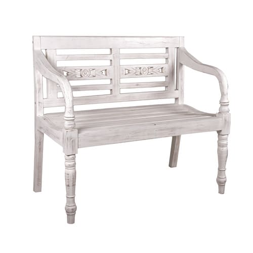 Eine Lasur dringt tiefer in das Holz ein und bildet eine schützende, aber dennoch atmungsaktive Schicht, die die natürliche Holzmaserung sichtbar lässt. Eine Lackierung hingegen bildet eine deckende Schicht auf der Oberfläche. Die weiße Lasur der »Moyo« Bank schützt das Holz effektiv, betont dessen natürliche Beschaffenheit und ermöglicht eine gewisse Diffusion von Feuchtigkeit, was das Risiko von Rissbildung reduziert.