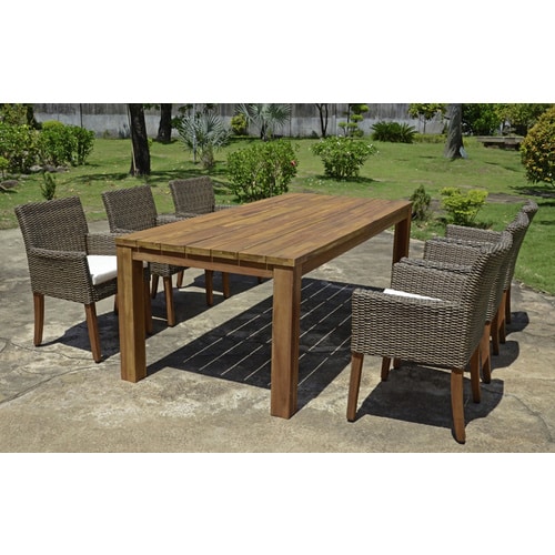 - Akazienholz: Bekannt für seine natürliche Schönheit und hohe Widerstandsfähigkeit gegen Witterungseinflüsse. Akazienholz entwickelt mit der Zeit eine silbrig-graue Patina, die den Charakter des Möbels unterstreicht. Seine dichte Struktur macht es unempfindlich gegenüber Feuchtigkeit und Insektenbefall, was eine lange Lebensdauer garantiert.