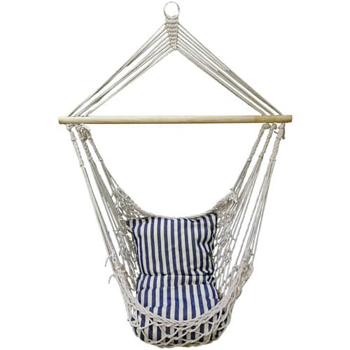 Das verwendete Holz zeichnet sich durch seine natürliche Maserung und eine angenehme, glatte Oberfläche aus. Es ist robust und verleiht dem Hängesessel eine warme und einladende Ausstrahlung. Die blaue Auflage aus strapazierfähigem Textilgewebe ist weich und hautfreundlich, ideal für lange Entspannungsphasen.