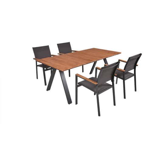 Holz strahlt eine natürliche Wärme und Haptik aus, die von rein synthetischen Materialien nicht erreicht werden kann. Es fühlt sich angenehmer an und verleiht dem Außenbereich eine organische und einladende Atmosphäre. Die Kombination mit Aluminium und Kunststoff in der »DAVINA« Tischgruppe bietet jedoch das Beste aus beiden Welten: die Wärme und Ästhetik des Holzes, gepaart mit der Langlebigkeit und Pflegeleichtigkeit der modernen Werkstoffe. Dies sorgt für ein ausgewogenes Verhältnis zwischen Design, Komfort und Funktionalität.