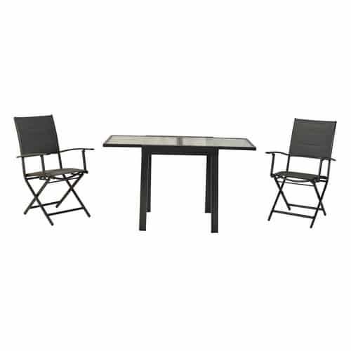 Das Set besteht in der Regel aus zwei Stühlen und einem Beistelltisch. Die genauen Maße der Stühle und des Tisches variieren leicht, sind aber darauf ausgelegt, kompakt zu sein. Typische Maße für einen solchen Balkontisch liegen bei ca. 50-60 cm im Durchmesser oder als quadratische Variante. Genaue Abmessungen finden Sie in den produktspezifischen Details.