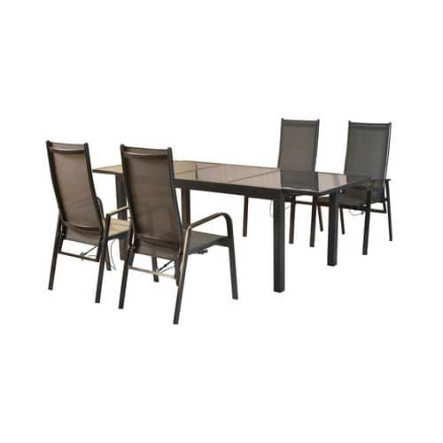 - Langlebigkeit durch hochwertiges Aluminium: Das Gestell des Tisches und die Stühle sind aus robustem Aluminium gefertigt, einem Material, das für seine Korrosionsbeständigkeit und Wetterfestigkeit bekannt ist. Dies garantiert eine lange Lebensdauer Ihrer Gartenmöbel, auch bei wechselnden Witterungsbedingungen.