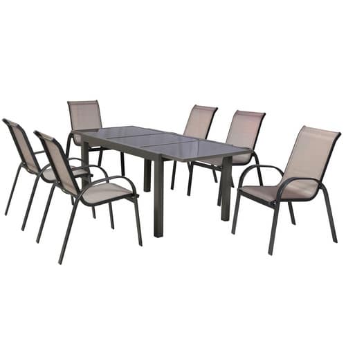 Der zu diesem Set gehörige Esstisch bildet das Zentrum Ihrer Outdoor-Erlebnisse. Mit seinen großzügigen Abmessungen bietet er ausreichend Platz für alle sechs Personen, um bequem Platz zu nehmen und gemeinsam zu speisen. Die Tischplatte ist robust gestaltet und resistent gegen alltägliche Gebrauchsspuren, die beim Essen im Freien entstehen können. Die stabile Aluminiumkonstruktion sorgt für einen sicheren Stand, selbst auf unebenen Untergründen. Die braune Pulverbeschichtung ist nicht nur optisch ansprechend, sondern auch funktional, da sie das Aluminium vor Kratzern und UV-bedingtem Ausbleichen schützt. Die Höhe des Tisches ist ergonomisch auf die Sitzhöhe der Stühle abgestimmt, um einen optimalen Esskomfort zu gewährleisten.