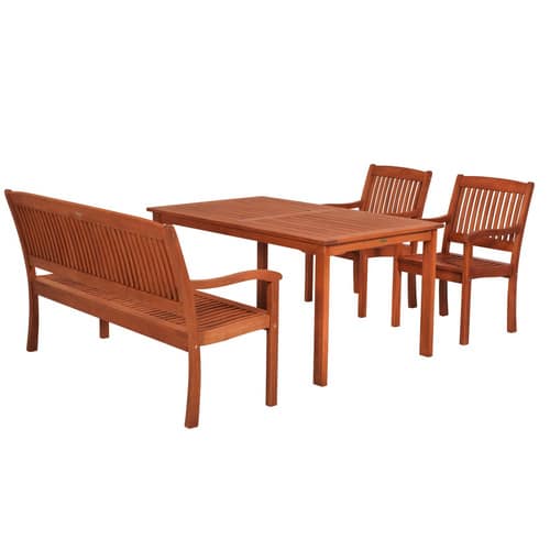 Das Set ist aus massivem Eukalyptus-Holz gefertigt, das von Natur aus witterungsbeständig ist. Für eine langfristige Erhaltung der Farbe und Oberflächenstruktur wird jedoch die Anwendung von Holzöl und gegebenenfalls der Schutz vor extremen Witterungsbedingungen empfohlen.