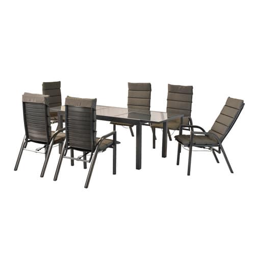 Die sechs dazugehörigen Stühle ermöglichen es Ihnen, eine größere Gesellschaft problemlos zu bewirten. Dank der robusten Aluminiumkonstruktion sind die Stühle wetterfest und pflegeleicht. Kleinere Verschmutzungen können einfach mit einem feuchten Tuch abgewischt werden. Dies macht das Set zu einer praktischen und wartungsarmen Wahl für jeden Garten oder jede Terrasse.