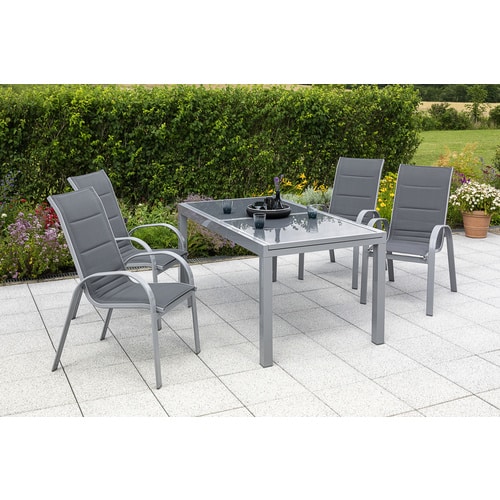 Das MERXX »Amalfi« Gartenmöbelset ist nicht nur für den klassischen Essbereich im Freien geeignet. Es kann auch als gemütliche Leseecke auf dem Balkon, als erweiterte Sitzmöglichkeit bei Grillpartys oder als stilvolles Element in einem Wintergarten dienen. Die Kombination aus Funktionalität und ansprechendem Design macht es zu einem flexiblen Möbelstück, das sich an Ihre individuellen Bedürfnisse anpassen lässt. Die silberne Farbgebung harmoniert hervorragend mit verschiedenen Dekorationselementen wie bunten Kissen, Pflanzen oder Außenleuchten, um Ihren persönlichen Stil zu unterstreichen.