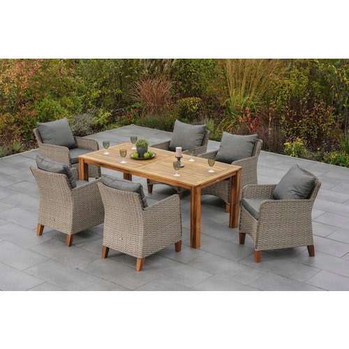 Im Lieferumfang des MERXX Gartenmöbelsets »Avellino« sind bereits hochwertige Auflagen enthalten, die für maximalen Sitzkomfort sorgen. Die weiche Polsterung und die strapazierfähigen Bezüge laden zum Verweilen ein und machen jede Mahlzeit oder jeden Kaffeegenuss im Freien zu einem besonderen Ereignis. Die Farbgebung der Auflagen harmoniert perfekt mit dem beigen Geflecht und dem natürlichen Holzton und unterstreicht die harmonische Ausstrahlung des Sets.