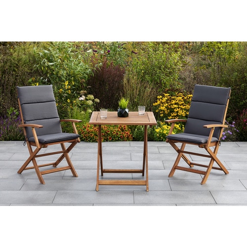 Dieses 3-teilige Set, bestehend aus einem Tisch und zwei Stühlen, ist speziell für all jene konzipiert, die den Komfort und die Ästhetik von Holzmöbeln schätzen, aber nur begrenzten Platz zur Verfügung haben. Ob für das Frühstück im Freien, den Nachmittagskaffee oder einen entspannten Ausklang des Tages – das »Comodoro«-Set lädt zum Verweilen ein. Die kompakten Maße machen es zur idealen Wahl für Balkone, kleine Terrassen oder sogar als stilvolle Ergänzung in einem größeren Gartenbereich.
