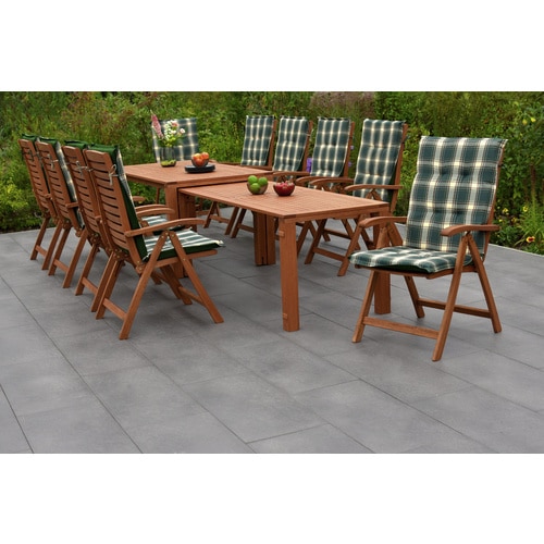 Das MERXX Gartenmöbelset »La Plata« ist die ultimative Lösung für alle, die ihren Außenbereich in eine großzügige und stilvolle Oase der Begegnung verwandeln möchten. Mit Platz für bis zu 10 Personen eignet sich dieses Set ideal für Familienfeiern, gesellige Grillabende mit Freunden oder einfach, um die warmen Sommertage in vollen Zügen zu genießen. Hochwertiges Eukalyptusholz und inklusive Auflagen in einem ansprechenden Grün machen es zur perfekten Wahl für jeden Gartenliebhaber.