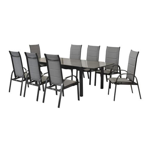 Das Design des »Marini« Sets ist auf Funktionalität und zeitlose Eleganz ausgelegt. Die klaren Linien und die zurückhaltende Farbgebung in Grau fügen sich harmonisch in jedes Garten- oder Terrassenambiente ein und setzen stilvolle Akzente. Die ergonomisch geformten Stühle bieten optimalen Sitzkomfort, auch bei längeren Aufenthalten im Freien. Die modulare Bauweise ermöglicht eine flexible Anordnung, sodass Sie das Set an Ihre individuellen Bedürfnisse und räumlichen Gegebenheiten anpassen können. Die Tischplatte aus hochwertigem Aluminium ist pflegeleicht und widerstandsfähig gegenüber Kratzern und Flecken, was das Set zu einem langlebigen Begleiter für viele Sommer macht.