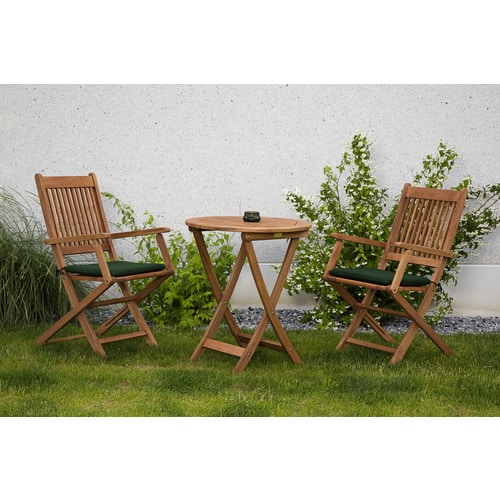 Die genauen Abmessungen der Stühle und des Sets finden Sie in den technischen Details auf der Produktseite. Dieses Set ist jedoch typischerweise für kompakte Bereiche konzipiert, um eine angenehme Nutzung auf Balkonen oder kleineren Terrassen zu ermöglichen.