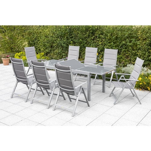 Das MERXX Gartenmöbelset »Taviano« mit acht Sitzplätzen ist die ideale Wahl für alle, die ihren Außenbereich in eine einladende Ess-Oase verwandeln möchten. Dieses Set kombiniert hochwertiges Aluminium mit strapazierfähigem Textil in einem eleganten Silberton und bietet somit Stil, Komfort und Langlebigkeit für Ihre Terrasse oder Ihren Garten.