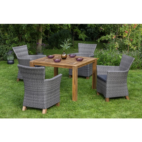 - Zeitlose Farbgebung: Das dezente Grau des Geflechts harmoniert perfekt mit dem warmen Braun des Akazienholzes und dem eleganten Aluminium. Diese Farbpalette fügt sich nahtlos in nahezu jede Garten- oder Terrassengestaltung ein und strahlt Ruhe und Stil aus.