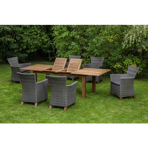 Häufig gestellte Fragen zu MERXX Gartenmöbelset »Toskana«, 6 Sitzplätze, Aluminium/Kunststoff/Akazienholz, inkl. Auflagen – grau