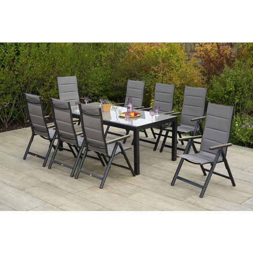 Das 9-teilige Set bietet genügend Kapazitäten für verschiedene Sitzanordnungen. Ob Sie eine intime Runde zu zweit gestalten oder eine größere Gruppe empfangen möchten, die Konfiguration des Sets lässt sich flexibel anpassen. Die klappbaren Stühle ermöglichen es Ihnen, je nach Bedarf mehr oder weniger Sitzplätze zur Verfügung zu stellen und den verbleibenden Raum anderweitig zu nutzen. Diese Anpassungsfähigkeit macht das »Trivero« Set zu einer äußerst praktischen Anschaffung für jeden, der seinen Außenbereich vielseitig nutzen möchte.