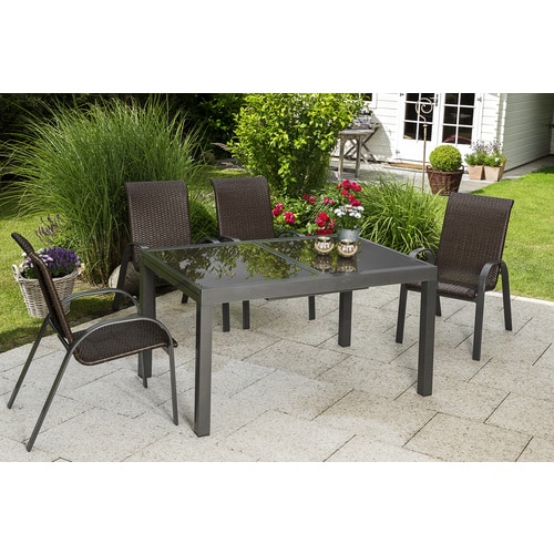 Das MERXX Gartenmöbelset »Varese« hat eine warme Braun-Optik. Sowohl das Kunststoffgeflecht der Stühle als auch die Tischplatte sind in verschiedenen Brauntönen gehalten, was dem Set eine natürliche und einladende Ausstrahlung verleiht.