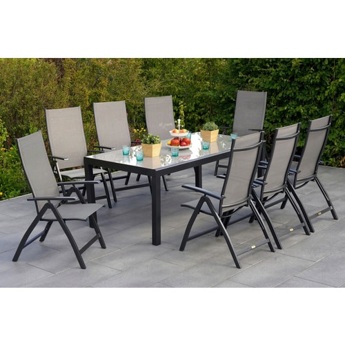 Die acht dazugehörigen Stühle sind ergonomisch gestaltet, um maximalen Sitzkomfort zu gewährleisten. Die Bespannung aus speziellem Textilgewebe passt sich der Körperform an und ermöglicht auch längeres Sitzen ohne Ermüdungserscheinungen. Das Gewebe ist nicht nur angenehm zur Haut, sondern auch strapazierfähig und widerstandsfähig gegenüber den Einflüssen des Außenbereichs. Die Rücklehnen sind so konzipiert, dass sie eine entspannte Sitzhaltung unterstützen. Die klappbare Natur jedes einzelnen Stuhls verstärkt die Gesamtflexibilität des Sets. Nach Gebrauch lassen sich die Stühle einfach zusammenklappen und platzsparend verstauen. Die klappbaren Gelenke sind aus langlebigem Material gefertigt, um eine zuverlässige Funktion über Jahre hinweg zu gewährleisten.