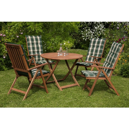 | Im Lieferumfang enthalten | Tisch, 4 Stühle, Sitzauflagen in Grün |