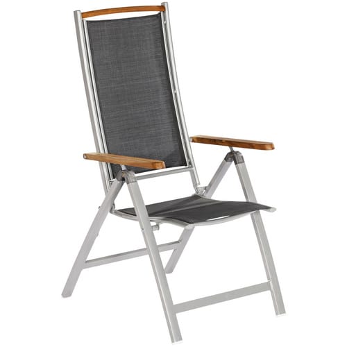 Der Klappstuhl »Siena« kombiniert hochwertige Materialien: Das Gestell besteht aus pulverbeschichtetem Aluminium, die Sitz- und Rückenfläche ist mit strapazierfähigem Textil bespannt, und die Armlehnen sind aus massivem Akazienholz gefertigt.