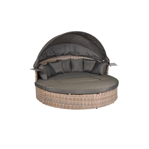Dank ihrer wetterbeständigen Materialien ist die Relaxinsel für den Dauereinsatz im Freien gut geeignet. Für eine optimale Langlebigkeit, besonders über die Wintermonate, wird jedoch die Verwendung einer passenden Schutzhülle empfohlen.