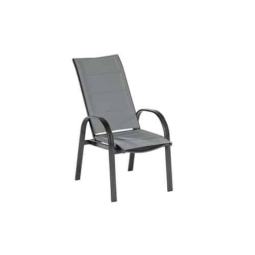 Die Sitz- und Rückenfläche ist mit einem hochwertigen Textilgewebe bespannt. Dieses Material wurde speziell für den Einsatz im Außenbereich entwickelt und kombiniert Atmungsaktivität mit einer angenehmen Haptik. Es ist UV-beständig, sodass die Farbe auch bei intensiver Sonneneinstrahlung nicht ausbleicht, und trocknet schnell nach einem Regenschauer. Die Gewebestruktur ermöglicht eine gute Luftzirkulation, was besonders an warmen Tagen für einen hohen Sitzkomfort sorgt, indem Staunässe vermieden wird und ein angenehmes Körperklima erhalten bleibt. Die Verbindung von Metall und Textil schafft eine optisch ansprechende und funktional überzeugende Einheit.