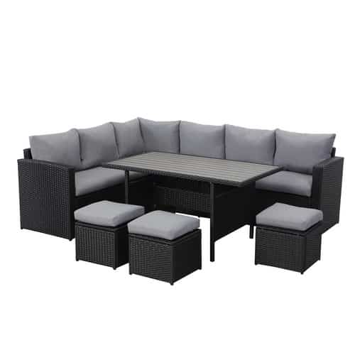 Ein typisches 6-teiliges Set dieser Art umfasst in der Regel eine Sitzbank oder mehrere Sessel sowie passende Stühle oder Hocker, oft ergänzt durch ein oder zwei niedrige Beistelltische. Die exakte Konfiguration kann je nach Modell variieren, aber dieses Set ist darauf ausgelegt, eine vollständige Sitzgruppe für mehrere Personen zu bilden.