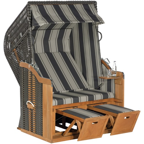 - Dekorative Elemente: Kleine Details wie die geflochtenen Elemente und die Farbgebung in Grau verleihen dem Strandkorb eine moderne und elegante Ausstrahlung, die sich harmonisch in jede Gartengestaltung einfügt.