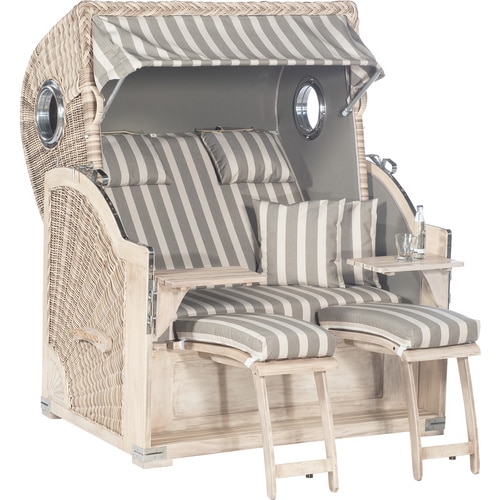 | Design-Elemente | Klassische Korbstruktur mit maritimen Akzenten, durchdachte Formgebung für optimalen Wind- und Sonnenschutz. |