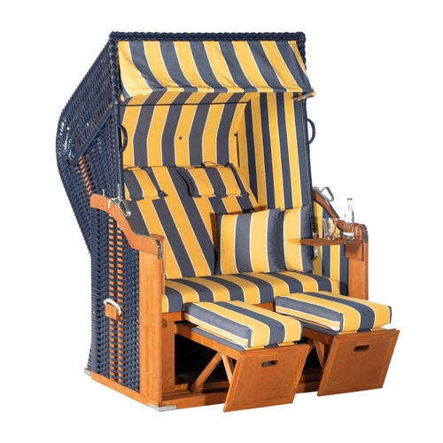 Die 2-Sitzer-Ausführung des Strandkorbs ist ideal für Paare oder Eltern mit einem Kind, die gemeinsam entspannen möchten. Sie bietet ausreichend Platz, um bequem nebeneinander zu sitzen oder zu liegen, und schafft eine gemütliche Atmosphäre für gemeinsame Stunden im Freien.