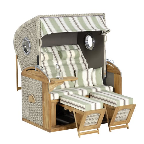 Dieser Strandkorb wurde konzipiert, um Ihnen maximalen Komfort zu bieten. Die verstellbare Rückenlehne ermöglicht es Ihnen, die perfekte Position zum Entspannen zu finden, sei es aufrecht sitzend mit einem Buch oder leicht zurückgelehnt, um die Sonne zu genießen. Die integrierten Fußstützen erhöhen den Liegekomfort und laden zum Verweilen ein. Zwei ausklappbare Ablagen bieten praktischen Platz für Getränke, Snacks oder Ihre Lektüre. Die bequemen Nackenrollen und Kissen runden das Wohlfühlerlebnis ab und machen jede Sitzposition zu einem Vergnügen.