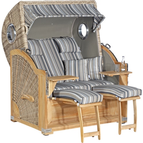- Praktische Extras: Oftmals verfügen Strandkörbe dieser Klasse über zusätzliche Annehmlichkeiten wie ausziehbare Fußstützen, hochklappbare Tische oder integrierte Ablagen für Getränke und Bücher.